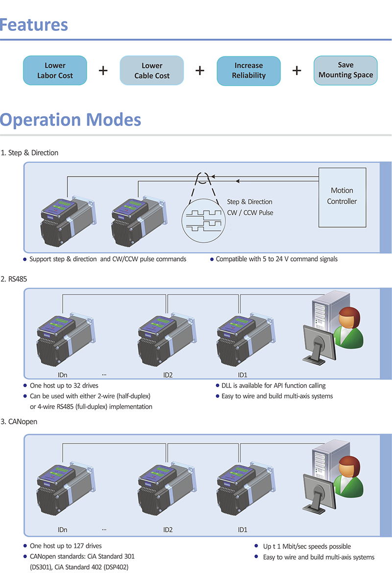 适合各种小型自动化设备或高集成度步进系统,如喷绘机、写真机、医疗检测设备、绘图仪、电子加工设备等。在用户期望空间占用小,布线简洁的低振动、低噪声、高速度设备中应用效果特佳。